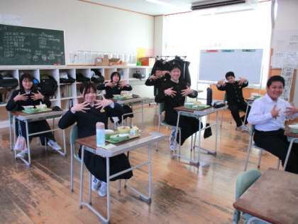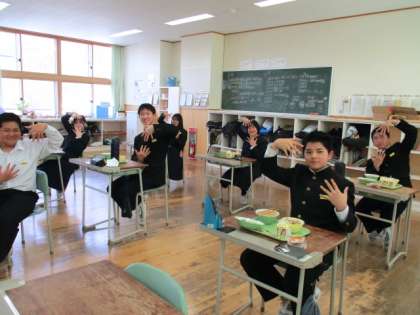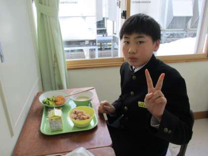 3月4日(金) 1年生の給食風景です。 放送当番の生徒もいました。 指と指を向かい合わせにするポーズ…?