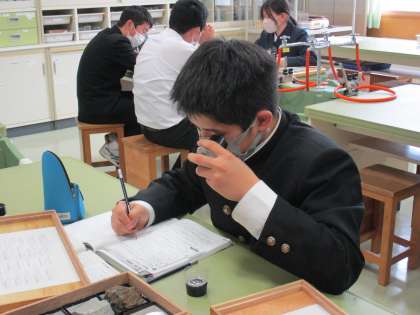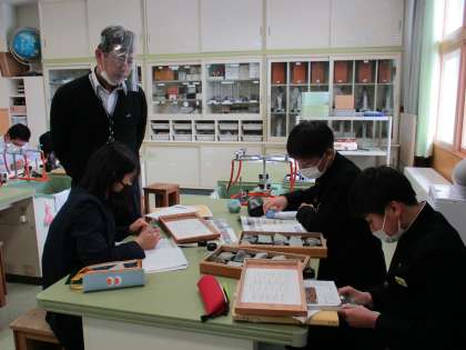3月7日(月) 1年生の理科の授業の様子です。 岩石の中の化石を見つけていました。