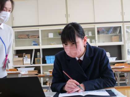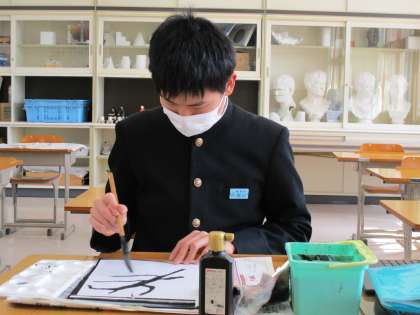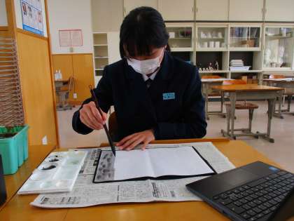 2年3限 美術 公開日 2022/03/08 更新日 2022/03/08 日々の活動から 3月8日(火) 2年生の美術の授業の様子です。 「墨の表現の様々な効果を知ろう」という水墨画に取り組んでいます。