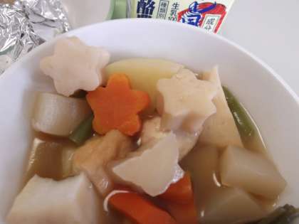 今日は「関東だき」の中に、《花型》の〈にんじん〉〈かまぼこ〉と《蝶々型》の〈こんにゃく〉が入っていました。