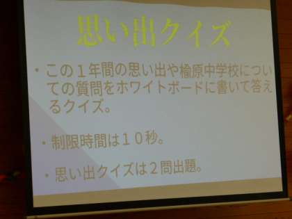 3年生を送る会 公開日 2022/03/11 更新日 2022/03/11 日々の活動から 「思い出クイズ」など難問が用意されていました。 『早押し』で答えたり、『ボードに書いて』答えたり、ジェスチャーを当てたりと工夫されていました。