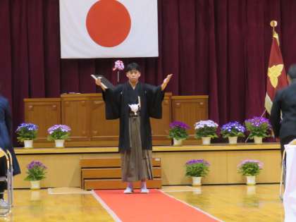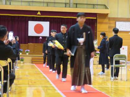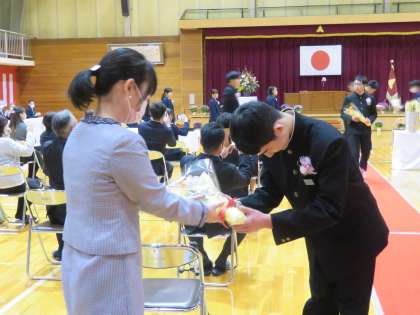 いよいよ卒業生退場です。 退場する際に卒業生から保護者へ花束贈呈がありました。