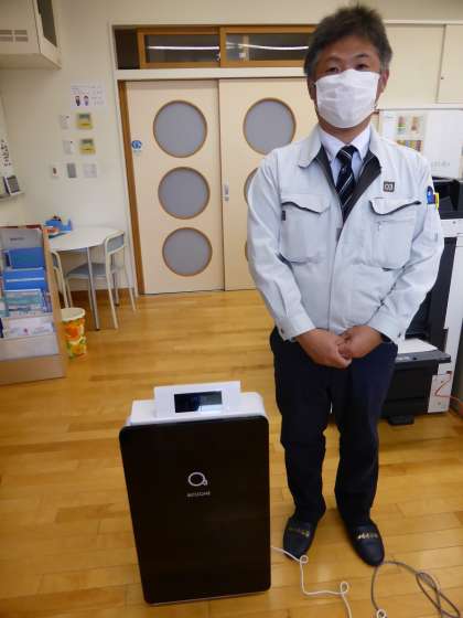 本日、丸三製薬 様 から空気清浄機の寄贈があり、会社の方がもってきてくださいました。その使い方、手入れの方法などについても教えていただきました。
