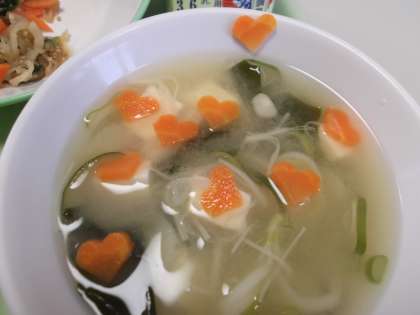 今日は「みそ汁」の中に《ハート型》の小さな〈にんじん〉がたくさん入っていました。10個以上入っていました。