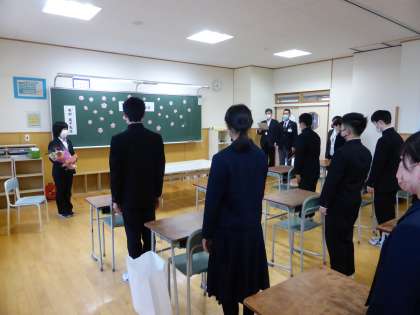 中学校・学びサポート講師 離任式 公開日 2022/03/19 更新日 2022/03/19 日々の活動から 離任される布村先生から「他の人の意見に耳を貸しながらも、自分の意見をもってください」というお話をいただきました。 これまでたくさんお世話になりありがとうございました。
