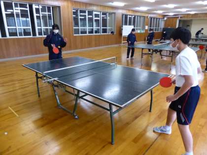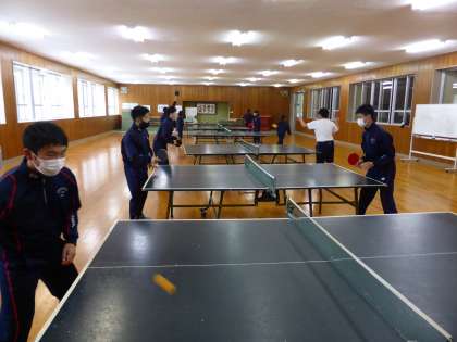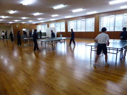 3月22日(火) 1・2年生の合同保健体育の様子です。 格技室で卓球をしました。
