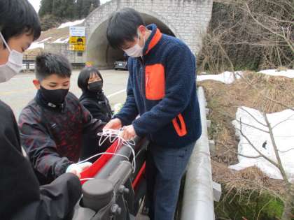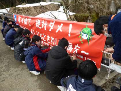 1年1・2限 「総合的な学習の時間(楡の木タイム)」 公開日 2022/03/23 更新日 2022/03/23 日々の活動から 地域の方にも手伝っていただきながら、横断幕をガードレールに設置しました。 国土交通省の許可も取ってあります。