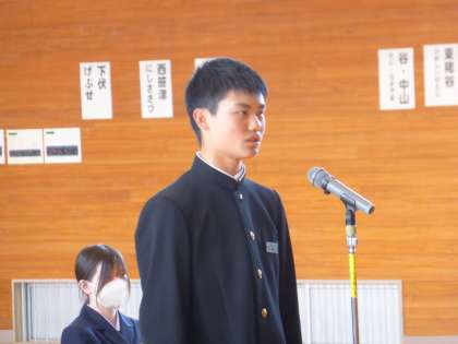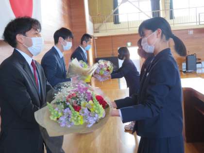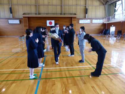 離任式 公開日 2022/04/06 更新日 2022/04/06 日々の活動から 生徒がお礼の言葉を言いました。 その後花束とメッセージを離任される先生方に渡しました。 最後は、花道を作って見送りをしました。
