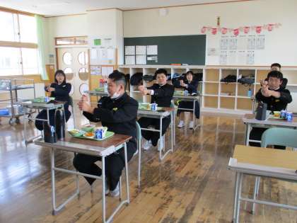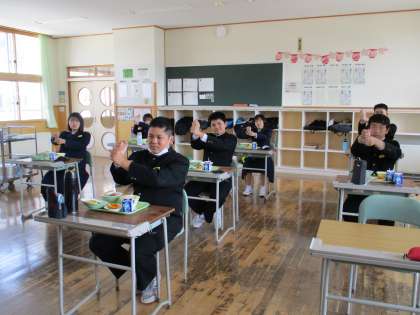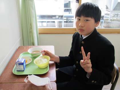 4月7日(木) 2年生の給食風景です。 放送当番の生徒もいました。
