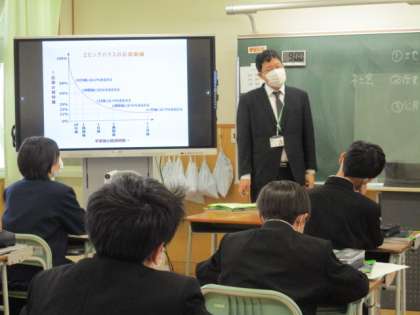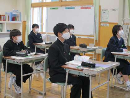 4月14日(木) 1年生の社会の授業の様子です。 今後の授業のすすめ方についての話を聞いていました。