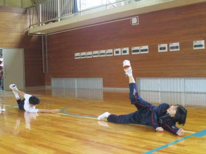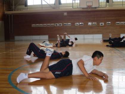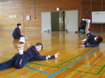 4月18日(月) 2年生の保健体育の授業の様子です。 体力テストに向けて様々な筋肉を鍛えていました。