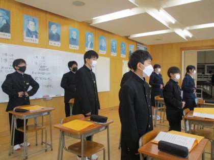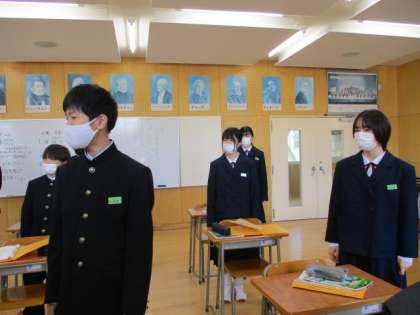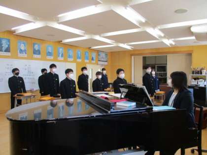 1年1限 音楽 公開日 2022/04/19 更新日 2022/04/19 日々の活動から 4月19日(火) 1年生の音楽の授業の様子です。 「言葉が伝わるように歌おう」という内容の授業でした。 発声練習をしてから校歌を歌っていました。