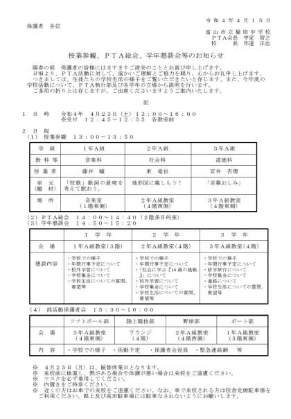 明日、23日(土)は、授業参観、PTA総会、学年懇談会、部活動保護者会を行います。内容につきましては、下記のプリントのとおり実施する予定です。時間等をご確認されてご来校ください。