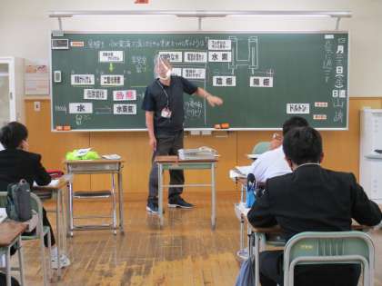 2年4限 理科 公開日 2022/04/22 更新日 2022/04/22 日々の活動から 4月22日(金) 2年生の理科の授業の様子です。 「水に電流を流したときの変化について考えよう」という内容の授業でした。