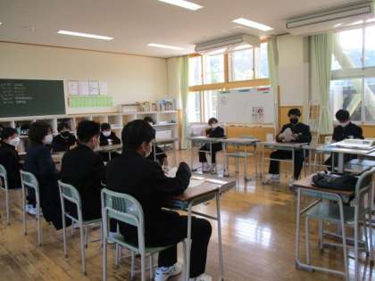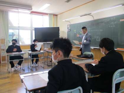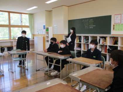 1年4限 道徳 公開日 2022/05/06 更新日 2022/05/06 日々の活動から 5月6日(金) 1年生の道徳の授業の様子です。 道徳主任が、1年生の初めての道徳の授業を行いました。 生徒全員が発表することができました。