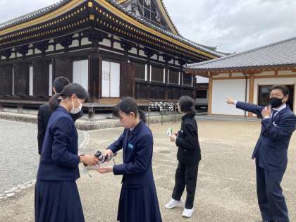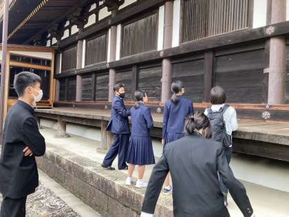 3年生 修学旅行3日目 公開日 2022/05/12 更新日 2022/05/12 日々の活動から 5月12日(木) 三十三間堂を見学している様子です。外観や建物の造りについて、タクシーの運転手さんから説明を受けました
