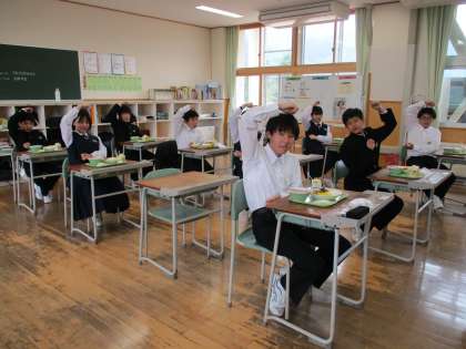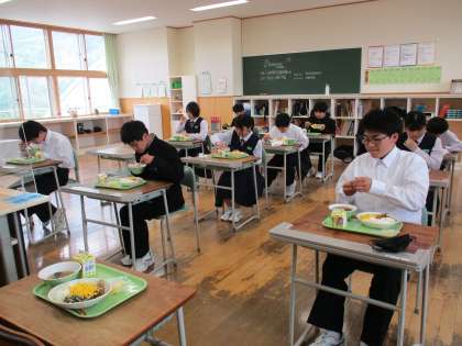 5月13日(金) 1年生の給食風景です。 放送当番の生徒もいました。