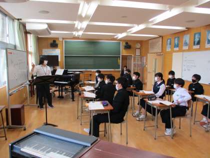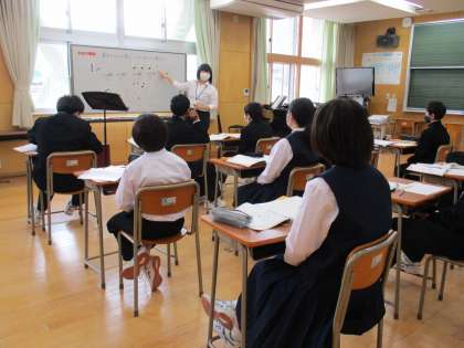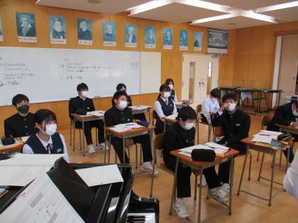 1年3限 音楽 公開日 2022/05/20 更新日 2022/05/20 日々の活動から 5月20日(金) 1年生の音楽の授業の様子です。 「基本のリズムを覚え、リズムパターンを考えよう。」という内容の授業でした。