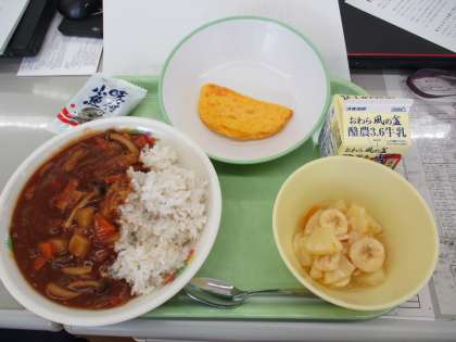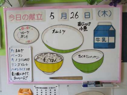 本日の給食 公開日 2022/05/26 更新日 2022/05/26 日々の活動から 5月26日(木) 本日の給食メニューです。 麦ご飯 牛乳 たべキリンハヤシ オムレツ フルーツポンチ 味付け小魚 でした。