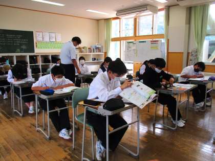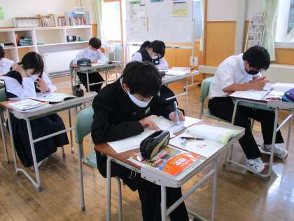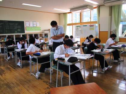 5月27日(金) 1年生の社会の授業の様子です。 中間考査対策問題に取り組んでいました。