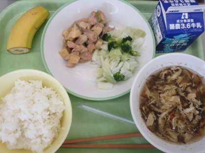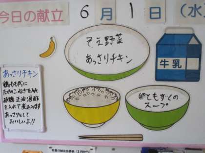 今日の献立は、ごはん、あっさりチキン、そえ野菜、卵ともずくのスープ、バナナ、牛乳です。