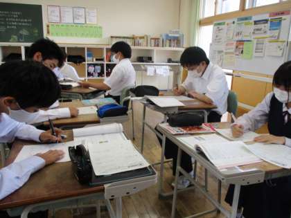 1年1限 数学 公開日 2022/06/06 更新日 2022/06/06 日々の活動から 6月6日(月) 1年生の数学の授業の様子です。 「仮の平均」を使って平均値を求める方法を学んでいました。 1章の復習をグループで行っていました。