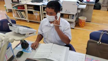 事業所の担当の方がおられる時間を見ながら、丁寧に電話をかけています。