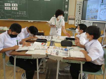1年5限 理科 公開日 2022/06/27 更新日 2022/06/27 日々の活動から 6月27日(月) 1年生の理科の授業の様子です。 「身の回りの物質とその性質について考えよう」という内容の授業でした。