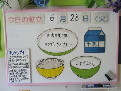 本日の給食 公開日 2022/06/28 更新日 2022/06/28 日々の活動から 6月28日(火) 本日の給食メニューです。 ごはん 牛乳 チンゲンサイソテー 赤魚の照り焼き ごまけんちん でした。