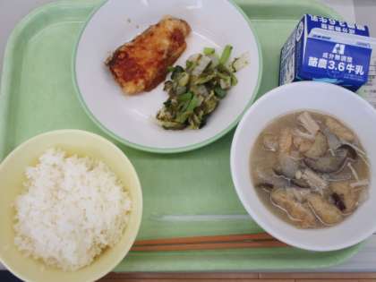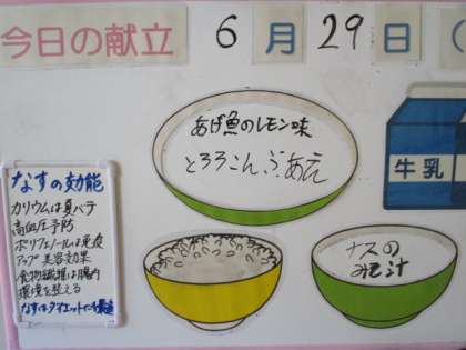 6月29日(水) 本日の給食メニューです。 ごはん 牛乳 揚げ魚のレモン味 とろろ昆布和え なすのみそ汁