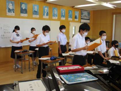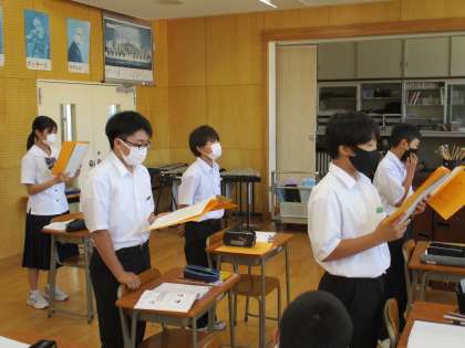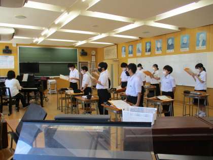 7月1日(金) 1年生の音楽の授業の様子です。 校歌の実技テストでした。