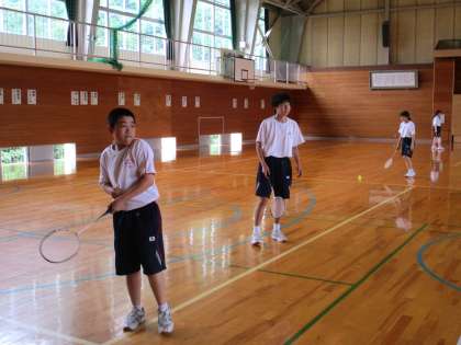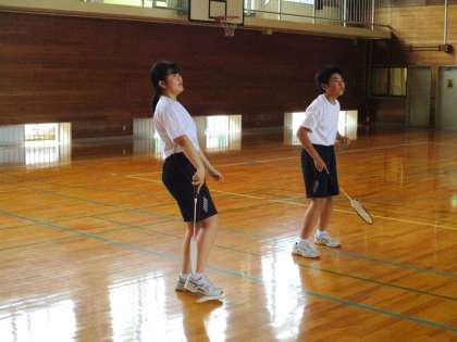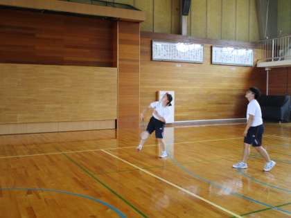 7月5日(火) 1年生の保健体育の授業の様子です。 バドミントンのダブルスの試合をしていました。