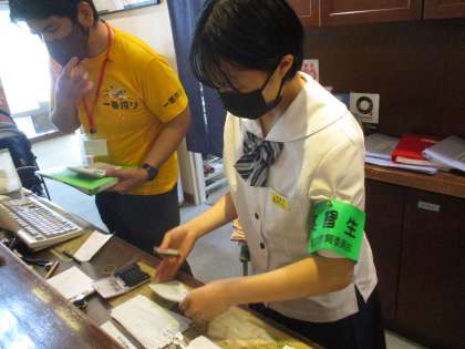 今日はフロントとレストランを担当していました。フロントでは、お客様の来店と同時にさわやかな声で「いらっしゃいませ」と挨拶をしていました。写真は、商品券のようなものにハンコを押している様子です。