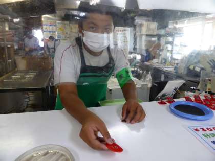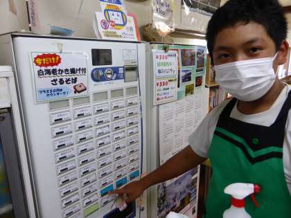 「社会に学ぶ『14歳の挑戦』」 トエンテイワン 2 公開日 2022/07/08 更新日 2022/07/08 日々の活動から 7月8日(金) 食券の買い方を説明してくれました。 食券と引き替えに番号札を渡してくれました。 番号札と引き替えに注文した品を渡してくれました。