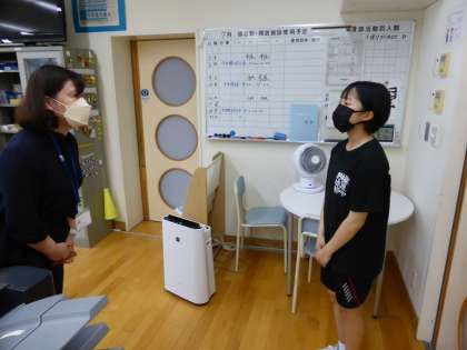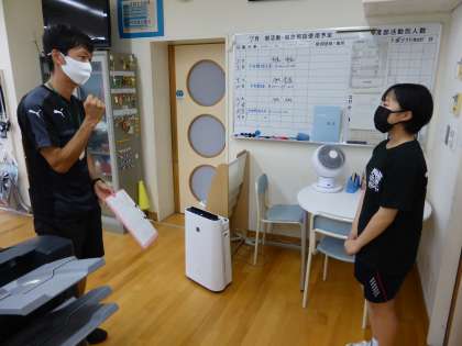 「社会に学ぶ『14歳の挑戦』」のため6限に参加できなかったソフトボール部の2年生が職員室に終了の報告に来ました。