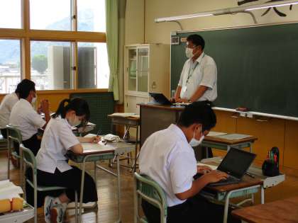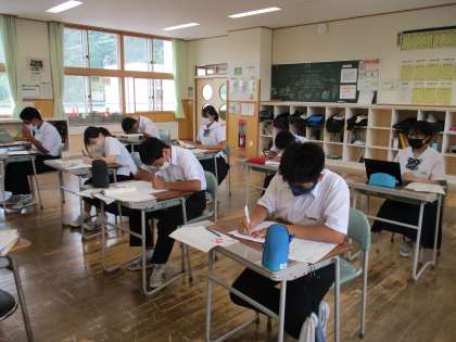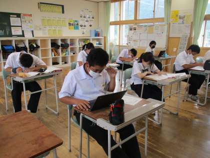 3限の続きでお礼の手紙の清書をしている生徒と「社会に学ぶ『14歳の挑戦』」のまとめをタブレットでしている生徒がいました。