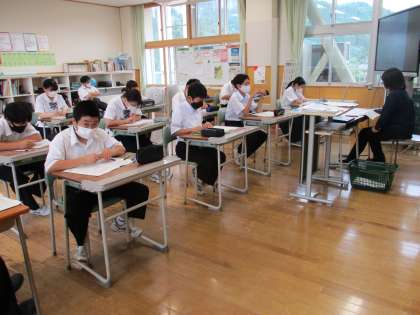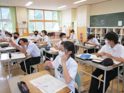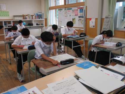 7月15日(金) 1年生の学級活動の様子です。 夏休みのしおりの読み合わせをしていました。