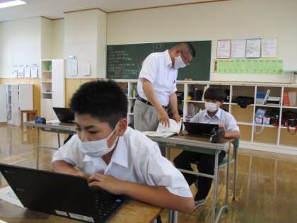 7月20日(水) 1年生の数学の授業の様子です。 タブレットを使って、数学の1学期の振り返りをしていました。