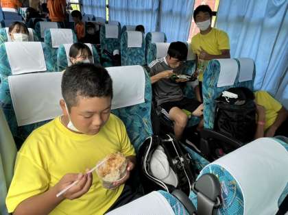 ボート部、昼休憩中です。 弁当を食べて午後に向けて体を休めています。 かき氷を食べている生徒もいます。