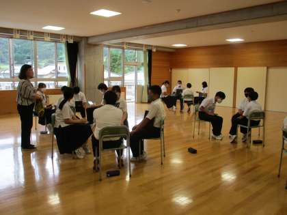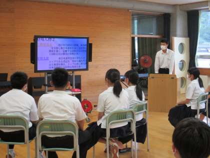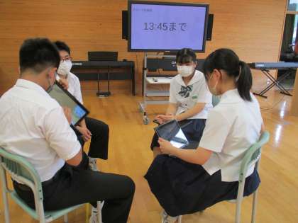 5限 全校合同国語 公開日 2022/09/01 更新日 2022/09/01 日々の活動から 9月1日(木) 合同国語では、「読書紹介スライド」を発表し合いました。 学年の枠を超えたグループ内で、Chromebookを用いての発表です。 代表となって全員の前で発表する生徒もいました。 発表を聞いて、読んでみたいという本に出会えたでしょうか… 読書の幅が広がることを期待しています。