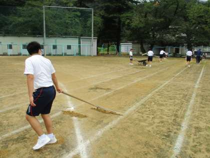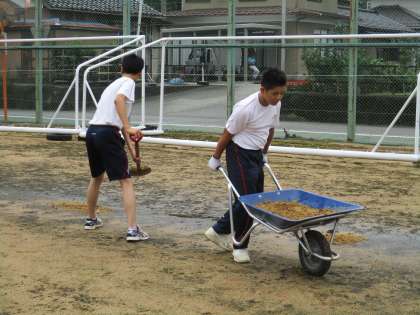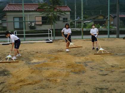 9月1日(木) 次に、グループ毎の活動をしました。 砂を運ぶ人、トンボをかける人