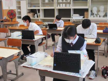 1年2限 美術 公開日 2022/09/27 更新日 2022/09/27 日々の活動から 9月27日(火) 1年生の美術の授業の様子です。 風景画の下書きをしている生徒と色塗りをしている生徒がいました。