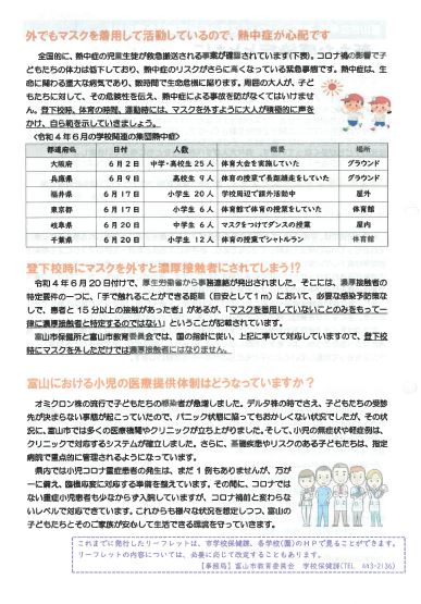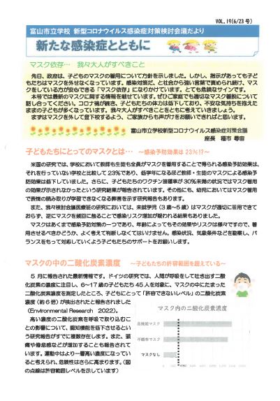 参考として、「富山市立学校 新型コロナウイルス感染症対策検討会議だよりVOL.19(6/23号)」を再掲しました。ここにもマスク着用についての考え方が記載されていますが、学校では、マスクを外せる場面(登下校時、運動時、室内でも距離がとれている時や周りに人がいない時等)ではマスクを外すようにしています。