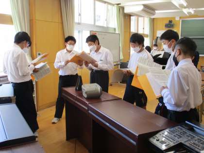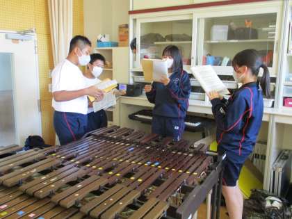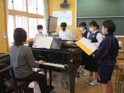 9月29日(木) 1・2年生の合同音楽の授業の様子です。 「心の瞳」のパート練習をしていました。