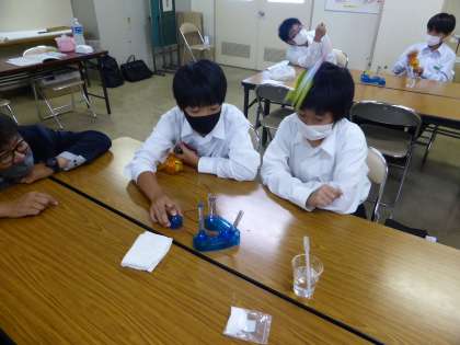 次に水を電気分解して水素を発生させてロケットを飛ばす実験をしました。