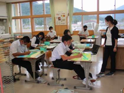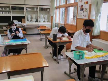 2年2限 美術 公開日 2022/10/04 更新日 2022/10/04 日々の活動から 10月4日(火) 2年生の美術の授業の様子です。 「風景に思いを重ねて」というテーマで 本時の課題は「画面全体を捉えて着色しよう」でした。