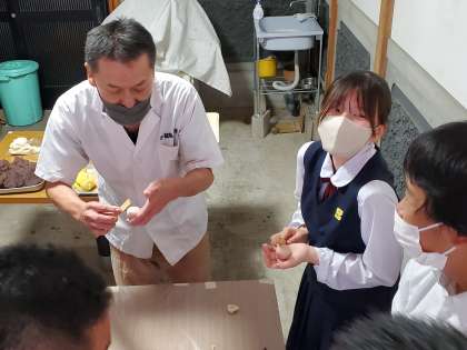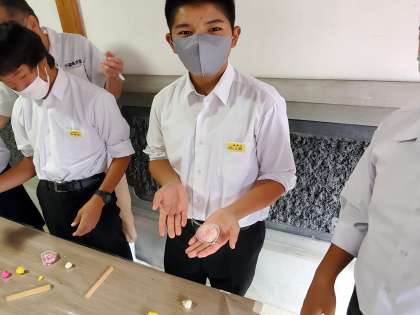 練ったあとは、様々な色のあんこをいれて、形を作ります! そのあと、16等分に模様をいれます。