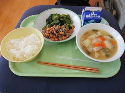 10月11日(火) 本日の給食メニューです。 ごはん、小魚フライビーンズ、海藻サラダ、ポトフ、牛乳です。