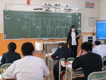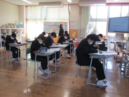 3限の授業の様子 公開日 2022/10/31 更新日 2022/10/31 日々の活動から 10月31日(月) 3年生は、社会で「裁判」という内容の授業でした。 2年生は、国語で「本論の問いと答え」という内容の授業でした。 1年生は、英語で「現在進行形」という内容の授業でした。