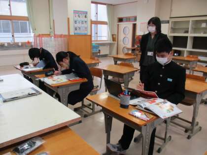 本日の3限の授業の様子 公開日 2022/11/01 更新日 2022/11/01 日々の活動から 11月1日(火) 本日の3限の授業の様子です。 1年生は、国語で「なぜ仮説が証明できたのか考えよう」という内容の授業でした。 2年生は、英語で教科書の本文を読んでいました。 3年生は、美術で和菓子のデザインを考えていました。